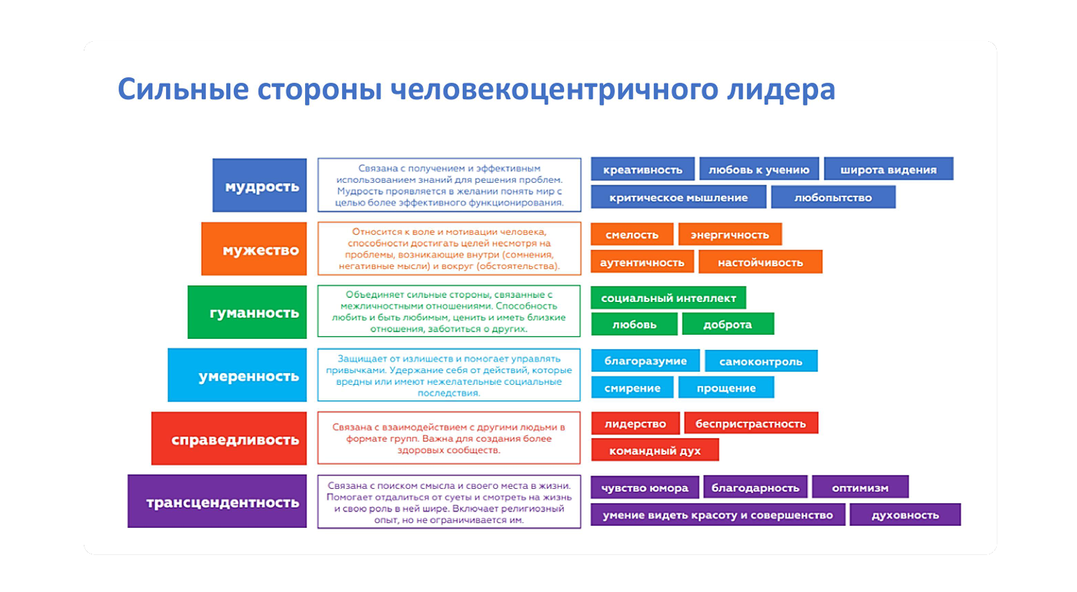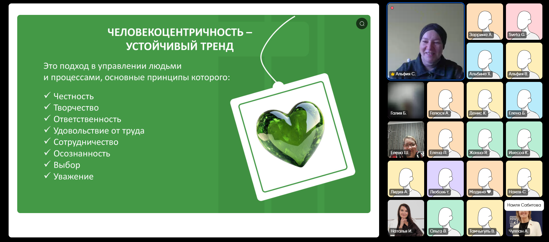 Основные принципы человекоцентричности включают честность, творчество, ответственность, удовольствие от труда, сотрудничество, осознанность, выбор и уважение. Участникам было предложено выполнить домашнее задание, связанное с выявлением своих сильных сторон.