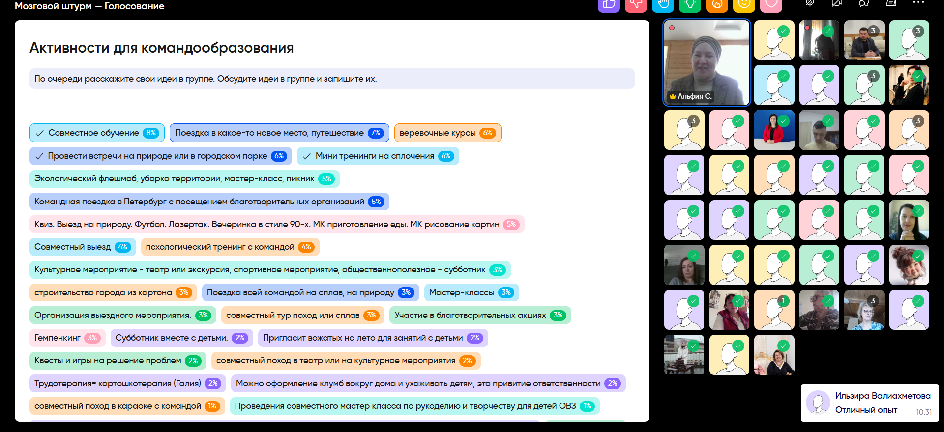 Во время интерактива участники разделились на группы и начали генерировать идеи для эффективных командообразующих мероприятий. От совместного обучения до выездов на природу — каждая команда делилась своими предложениями и ходила в гости в «кафе» к другой команде и знакомилась с вариантами от коллег. В режиме онлайн удалось собрать множество идей: от культурных мероприятий до строительства города из картона и даже совместной посадки картошки.