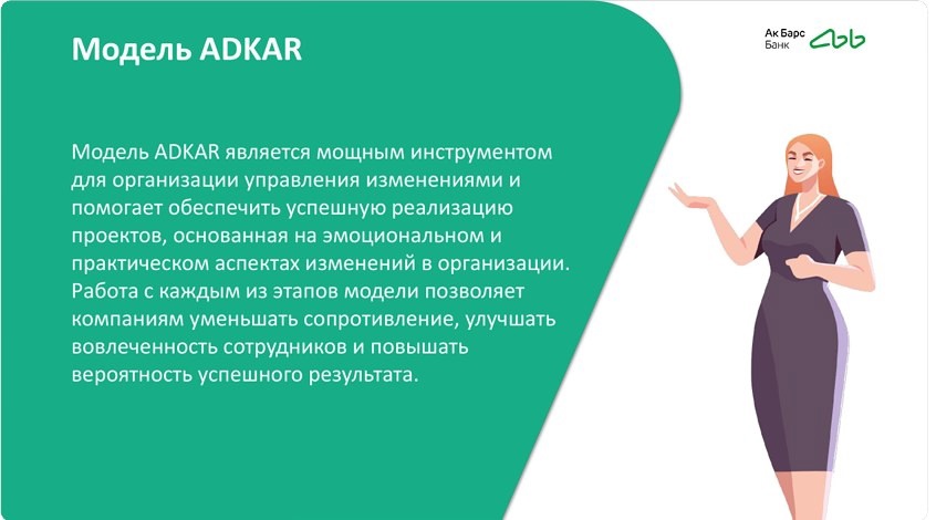 Модель «ADKAR», разработанная компанией «Prosci», предлагает структуру для управления изменениями на индивидуальном уровне. Этот подход акцентирует внимание на том, как помочь людям адаптироваться к изменениям и как успешно их реализовывать. Модель подходит для небольших и средних компаний, а в крупных организациях она может применяться лишь на уровне подразделений - подчёркивалось в ходе тренинга.