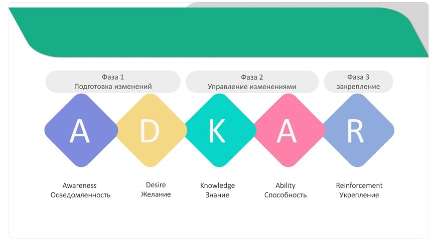 Модель «ADKAR» состоит из трёх фаз и пяти ключевых этапов: