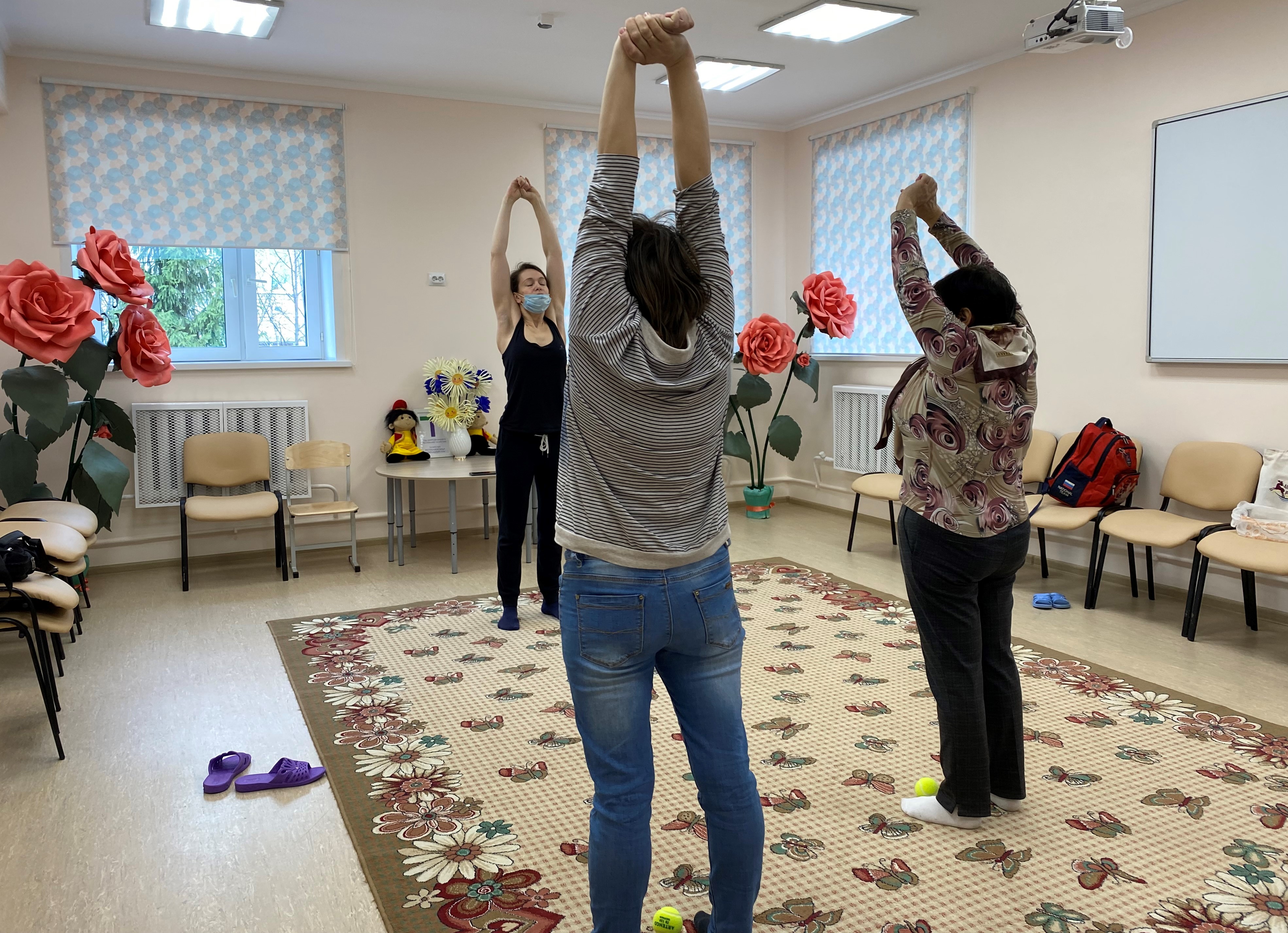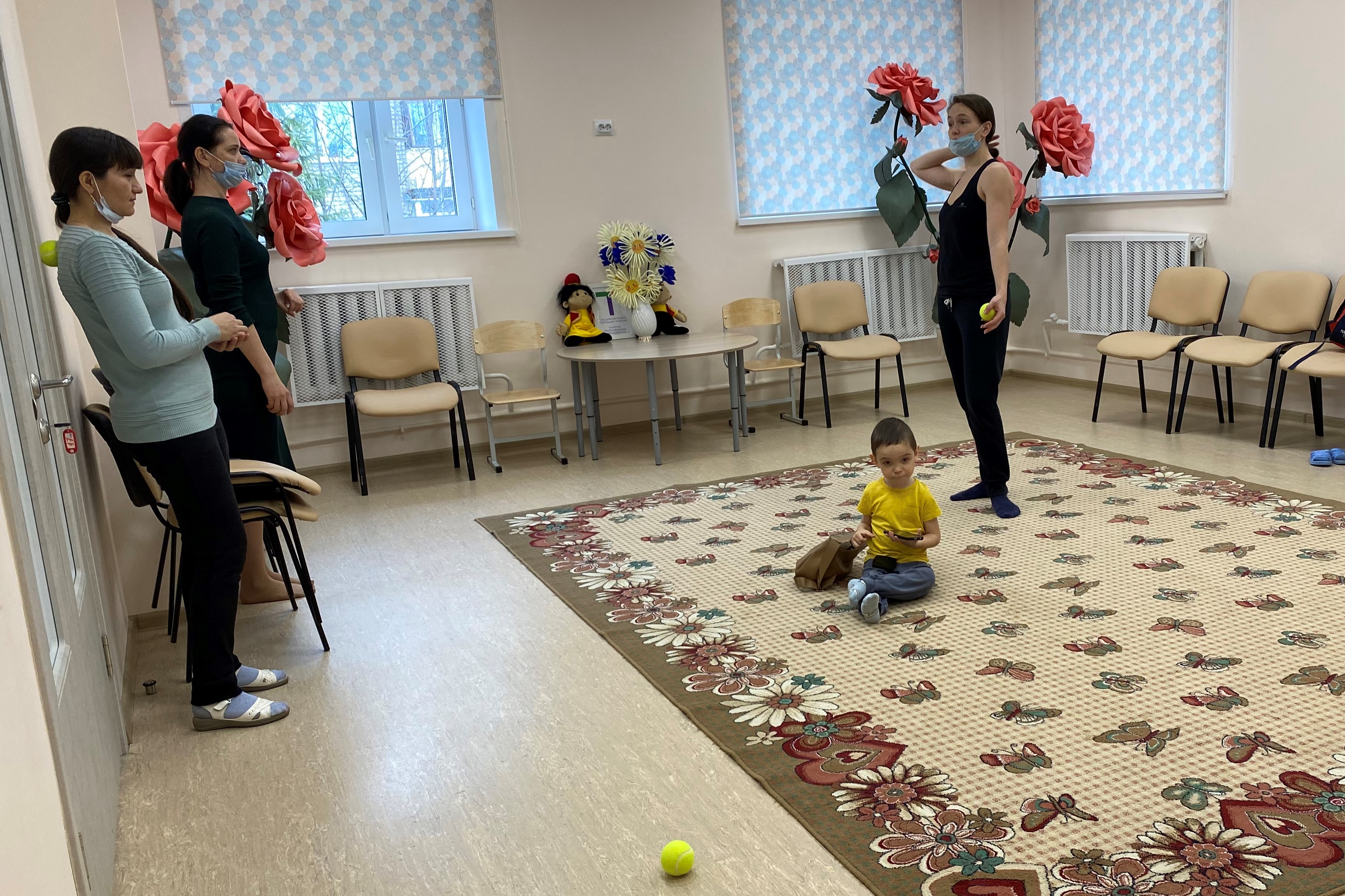 Хатын-кызлар дәрескә баласы үзәкнең белгечләре белән тернәкләндерү узган вакытта кушыла. Хатын-кызлар теннис тупларын стресска каршы көрәш чарасы буларак файдаланып, үзмассаж техникасын үзләштергәннәр.