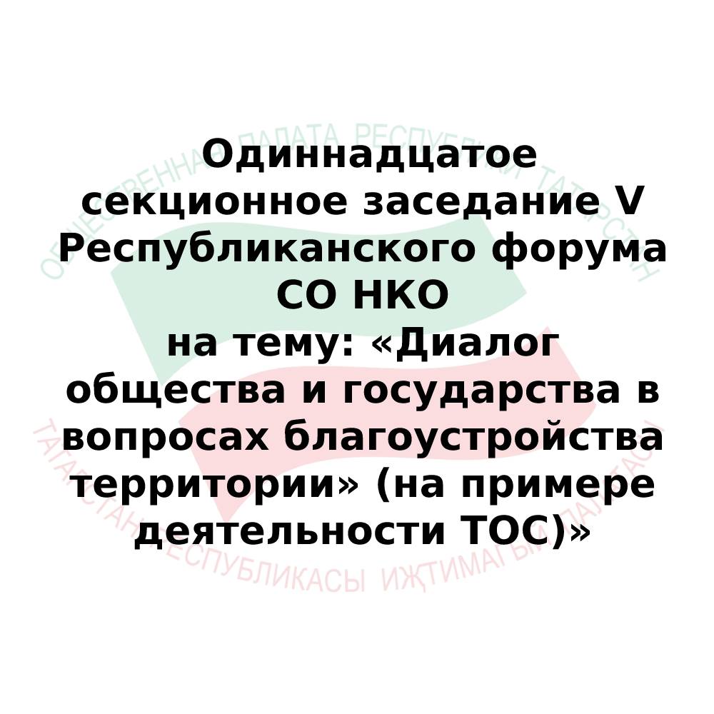 11 августта 10: 00 сәгатьтә социаль юнәлешле коммерцияле булмаган оешмаларның V Республика форумы кысаларында Яр Чаллы шәһәрендә, Академик Рубаненко урамы, 2 йорт, 1 нче комплекс, 2 («Нур» яшьләр үзәге, 2 нче кат) адресы буенча «Территорияне төзекләндерү мәсьәләләрендә җәмгыять һәм дәүләт диалогы» (территориаль иҗтимагый үзидарә эшчәнлеге мисалында) темасы буенча унберенче секция утырышы узачак.