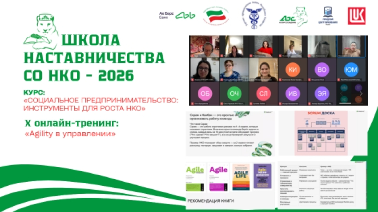 8 апрельдә Социаль юнәлешле коммерцияле булмаган оешмаларының остазлык мәктәбенең өченче курсы кысаларында «Коммерцияле булмаган оешмалар белән идарә итүдә Agility» темасына онлайн-тренинг үткәрелде. Дәресне Ак Барс банкының Корпоратив университеты бизнес-тренеры Диана Вәлиуллина үткәрде.